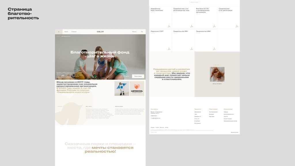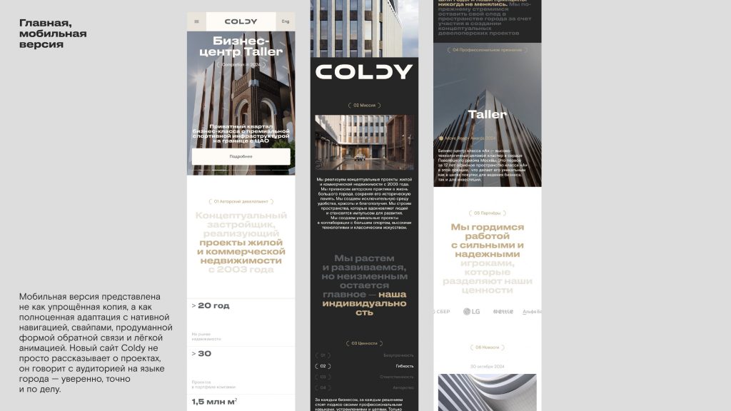 Современный девелопмент — это о том, как ты меняешь городскую среду. Как ты создаешь сообщества. Как ты относишься к наследию. Ребрендинг позволяет встроиться в этот контекст. Например, в том же проекте для Coldy мы отдельно проработали страницу о благотворительности — не как PR-ход, а как часть философии компании. Это сигнал: мы не просто строим, мы меняем среду на всех уровнях, и думаем о людях.