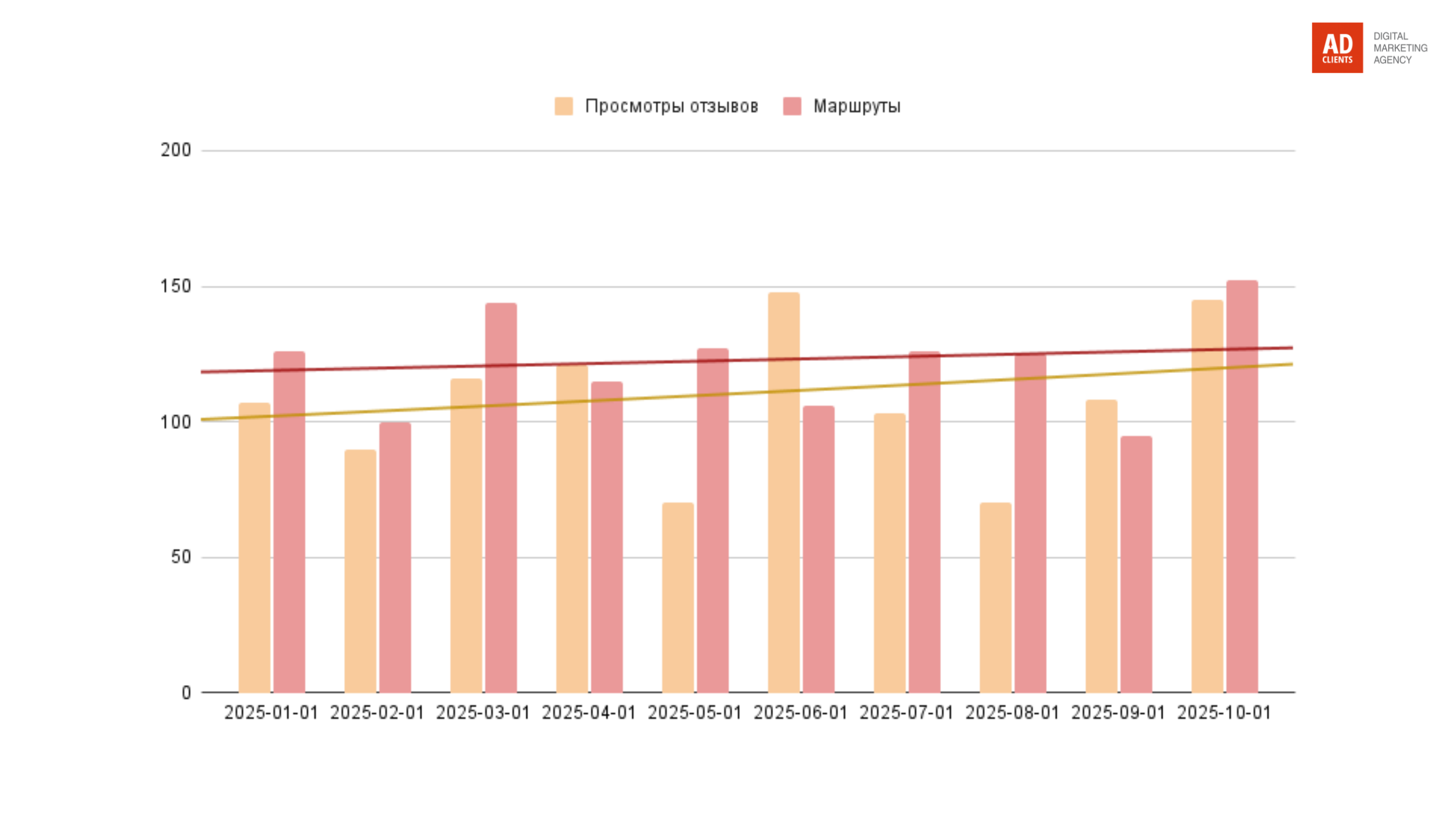 - Рост вовлеченности. Количество пользователей, просматривающих отзывы, увеличилось на 40%, а тех, кто строит маршрут к ЖК, — на 20%. Приросты этих показателей являются прямым следствием визуального доминирования проекта на картах и регулярного обновления контента.
