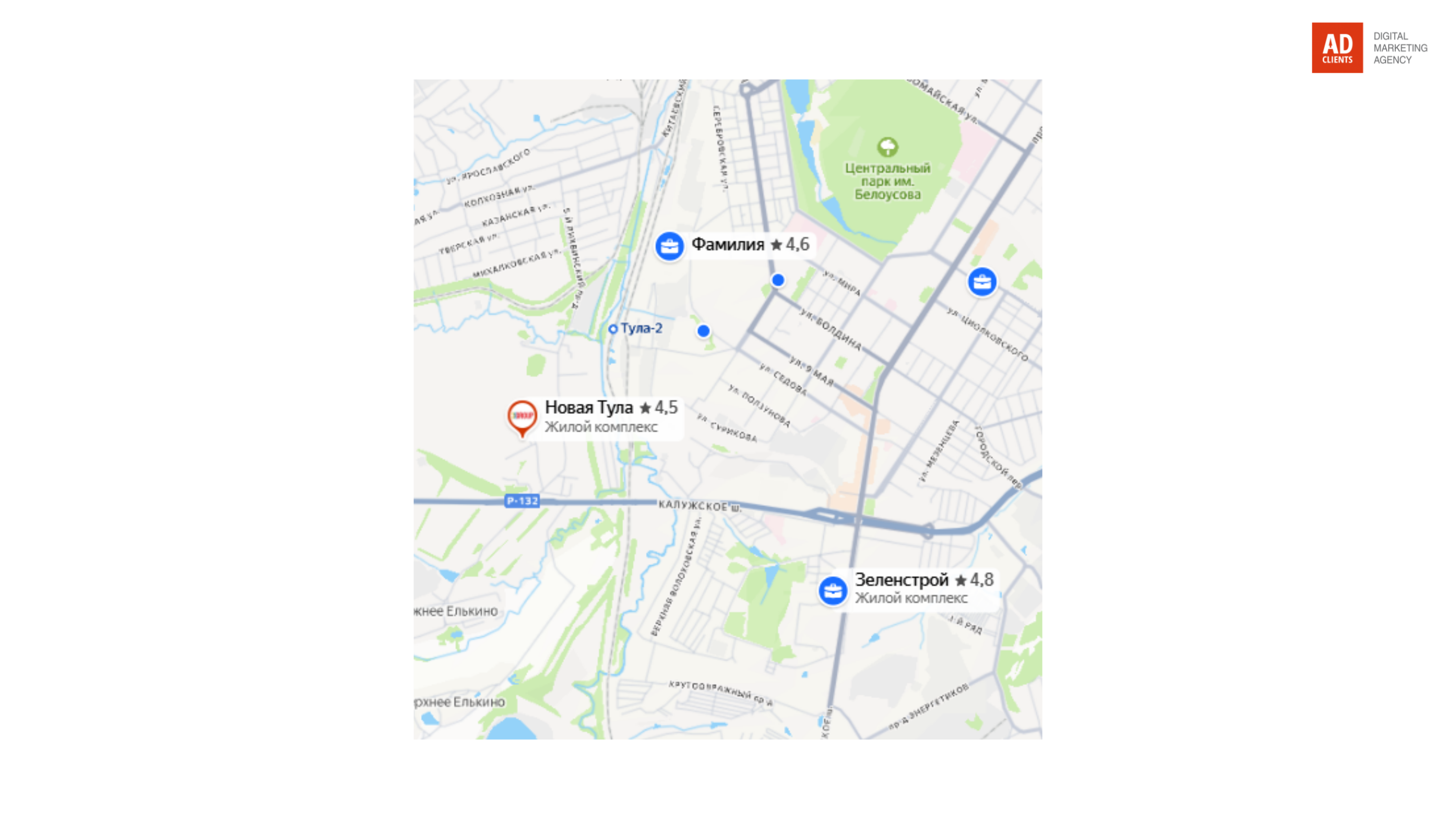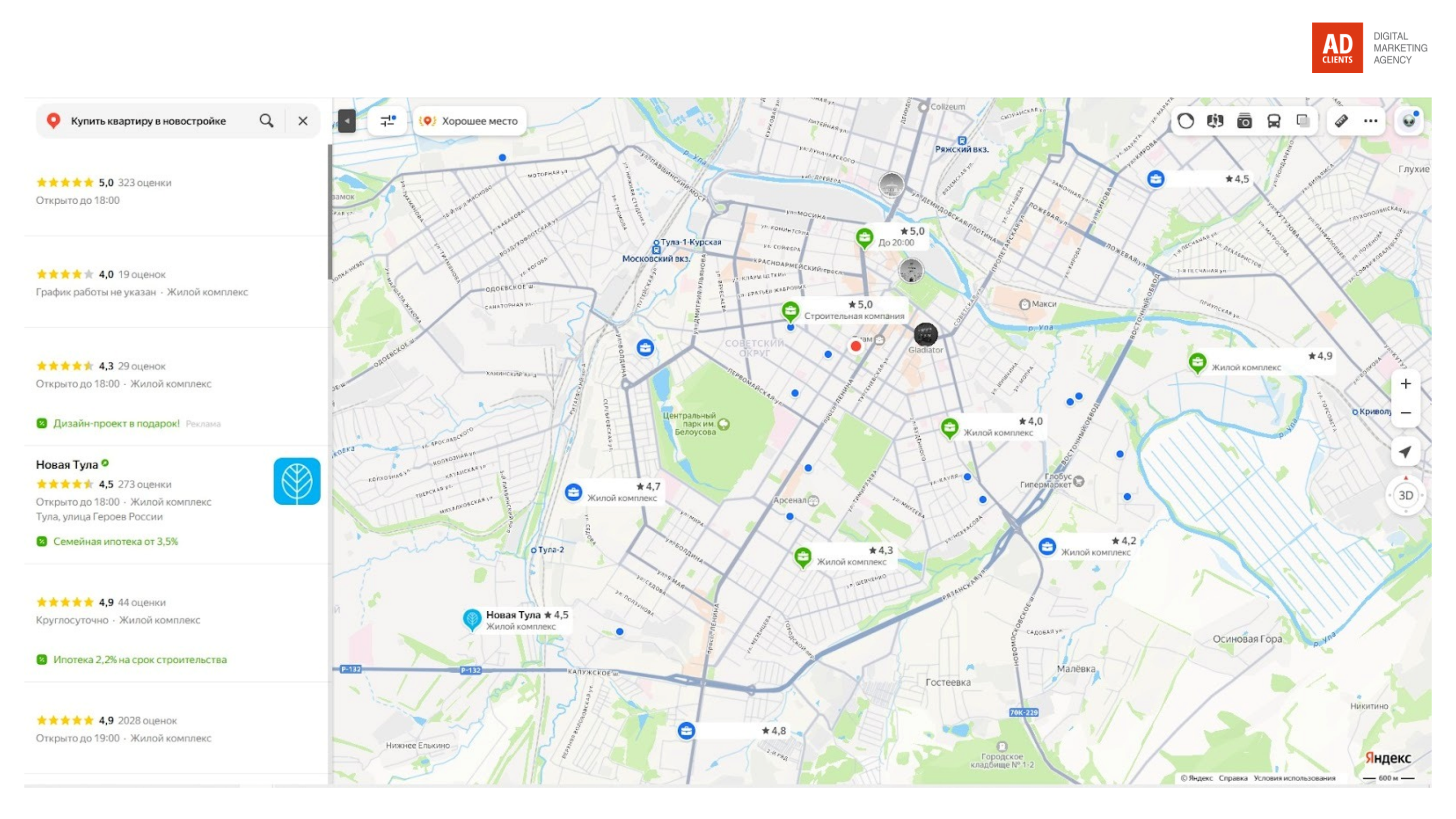 - Визуальное лидерство. «Новая Тула» — единственный в Туле жилой комплекс с брендированным логотипом на карте. В начале размещения использовали логотип с брендом застройщика, создавая привязку точки на карте к застройщику. На текущий момент в карточке используется фирменный логотип ЖК, который отображен и на фасадах его зданий, тем самым формируя ассоциацию местоположения с проектом.