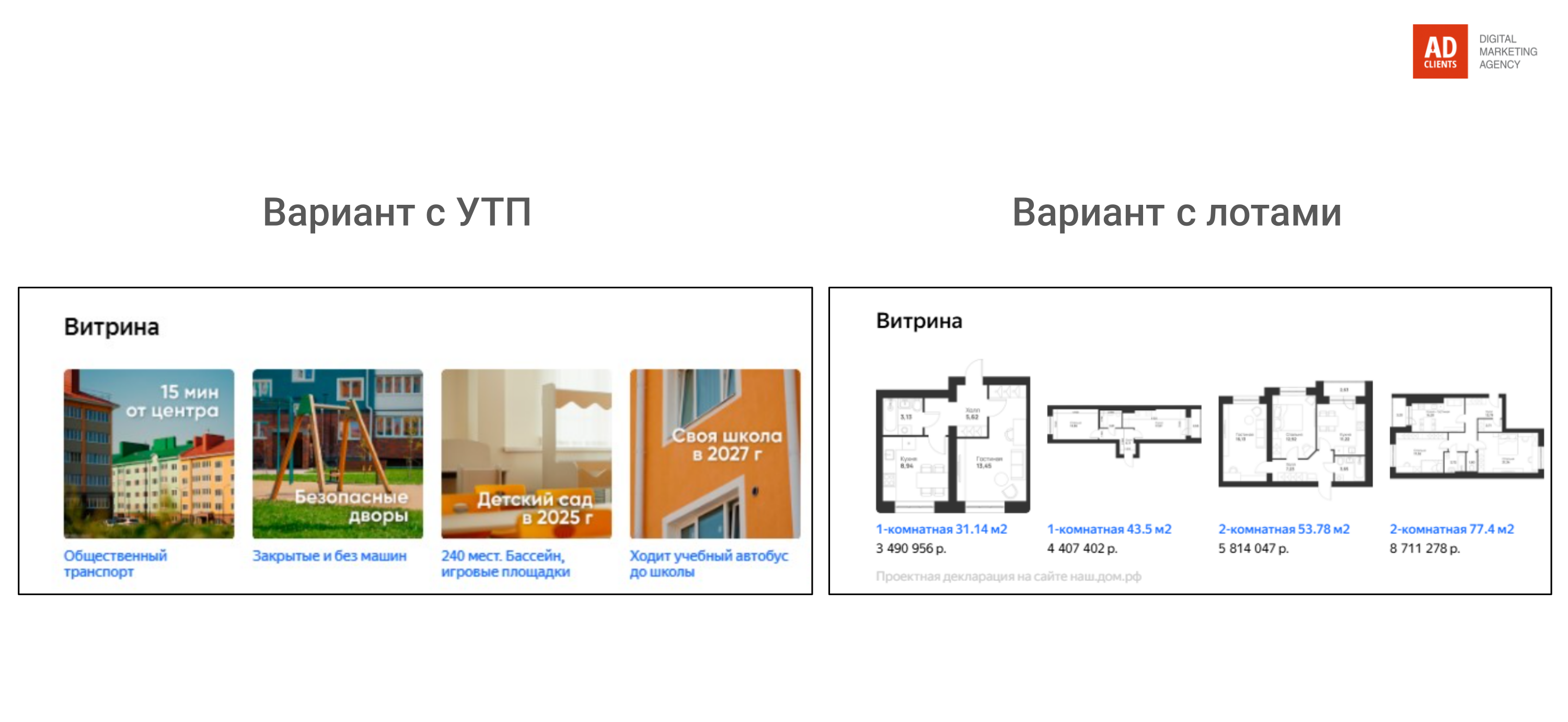- акцент на коммерческих условиях (с информацией о планировках и ценах лотов в ЖК).
