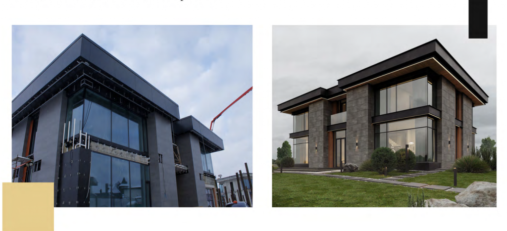 Мы используем многослойную конструкцию: газоблок, минеральную вату с ветрозащитой, вентиляционный зазор и облицовку итальянским керамогранитом Laminam. Такой фасад не боится влаги, резких перепадов температур, ветра и активного солнца. Он сохраняет геометрию и цвет, не выгорает и не растрескивается.