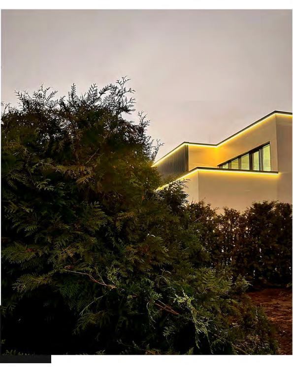 Вечером дом раскрывается иначе: мягкая подсветка лестниц, фасадов, входных групп и ландшафта подчеркивает пластику здания и делает перемещение безопасным. Свет становится не техническим дополнением, а инструментом, который формирует характер резиденции и подчеркивает ее эстетику в любое время суток.